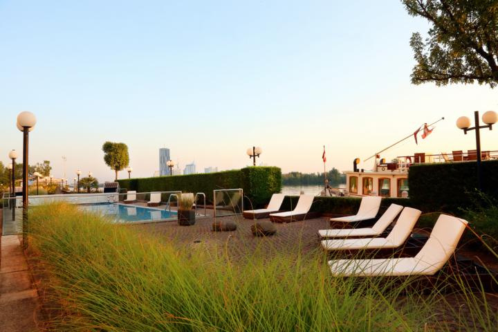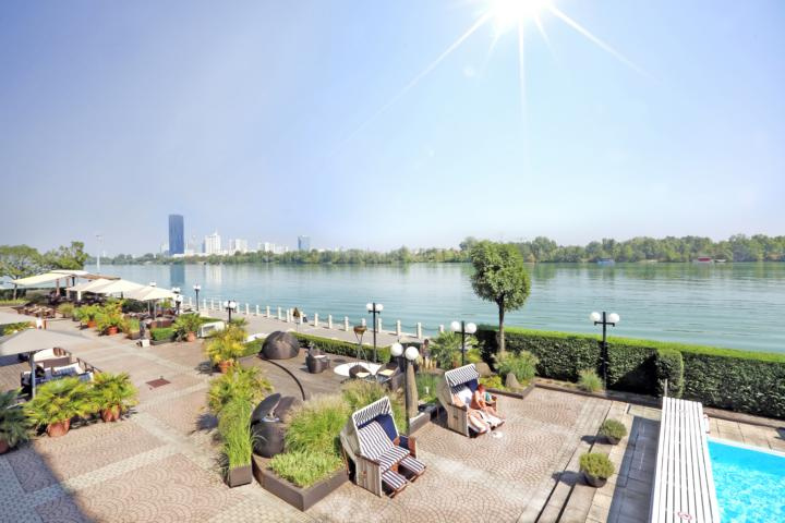 Schwimmen Sie ein paar Runden, genießen Sie den herrlichen Blick auf die Donau, tanken Sie etwas Sonne und entspannen Sie am Pool im Hilton Vienna Danube Waterfront.